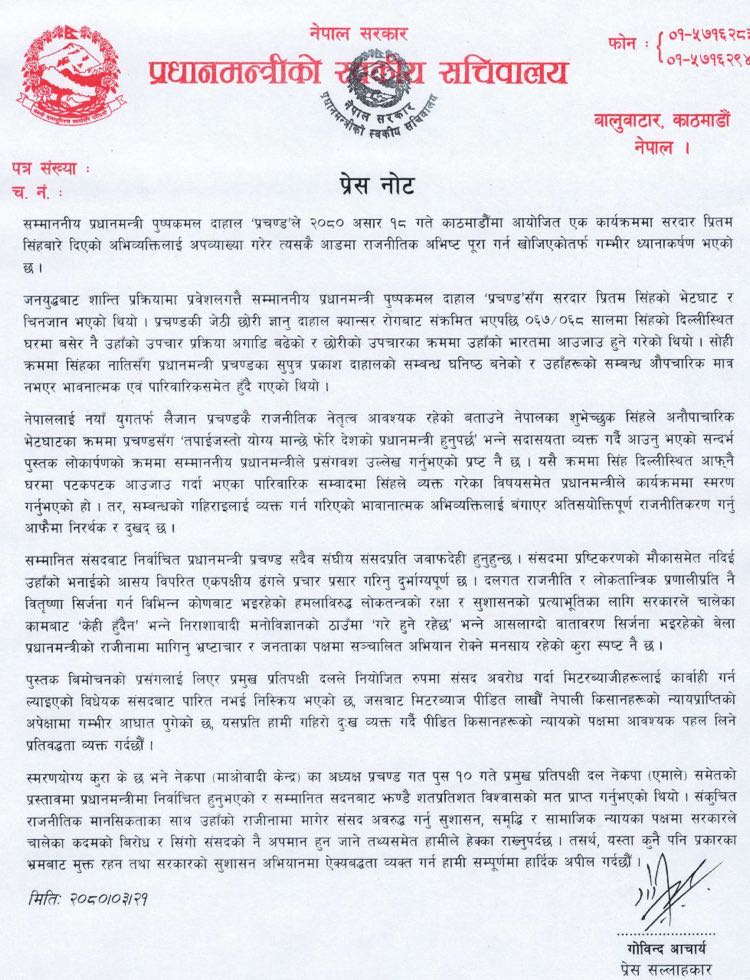 प्रधानमन्त्री प्रचण्डका प्रेस सल्लाहकार गोविन्द आचार्यले आज जारी गर्नुभएको प्रेस विज्ञप्तिमा प्रधानमन्त्री प्रचण्डले सरदार प्रितम सिंहबारे दिएको अभिव्यक्तिलाई लिएर राजनीतिक अभिष्ट पूरा गर्न खोजिएको दाबी गर्दै यस विषयमा सचिवालयको गम्भीर ध्यानाकर्षण भएको उल्लेख गरिएको छ ।