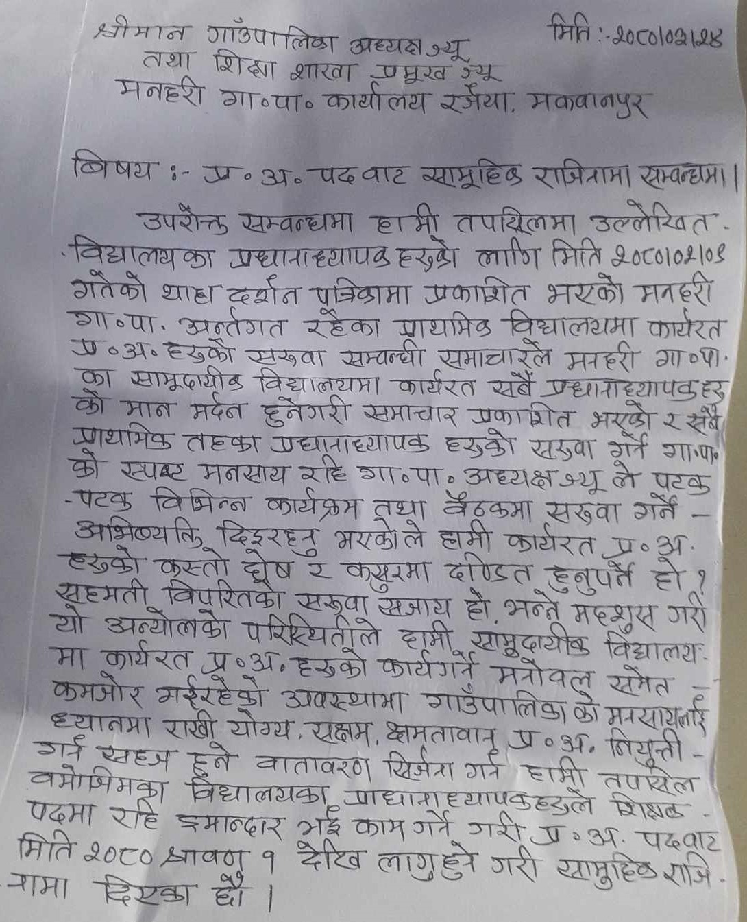 प्रधानाध्यापकहरुले दिएको सामूहिक राजीनामा साउन १ गतेदेखि लागू हुने गरी दिइएको पत्रमा उल्लेख छ । “सहमति बिपरितको सरुवा सजाय हो भन्ने महसुस गरी यो अन्योलको परिस्थितिले हामी सामुदायिक विद्यालयमा कार्यरत प्रधानाध्यापकलाई काम गर्ने मनोबल कमजोर भइरहेको परिस्थिति छ ।” राजीनामा पत्रमा उल्लेख छ ।