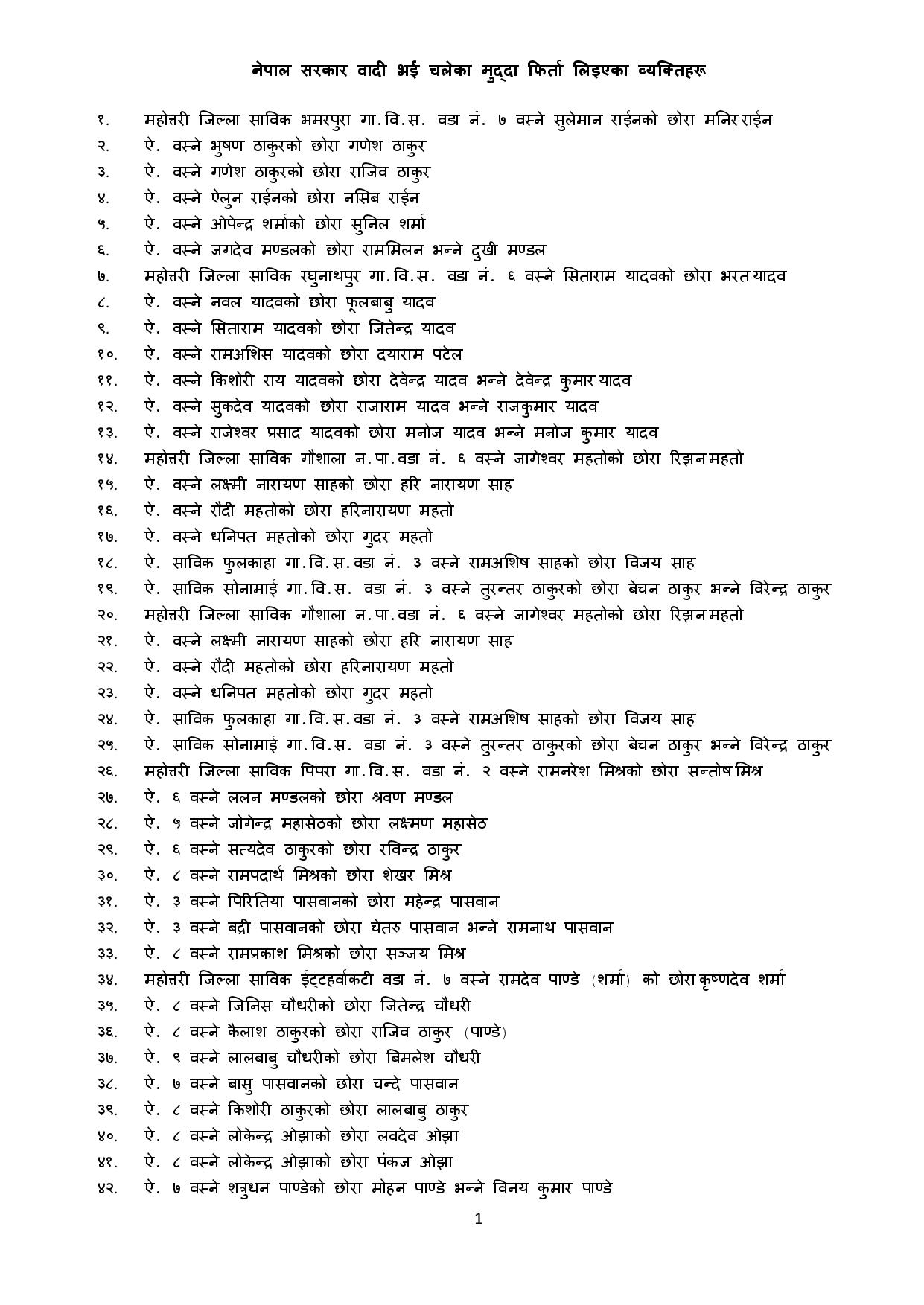 सूचना तथा सञ्चारमन्त्री पार्वत गुरुङले बुधबार मन्त्रिपरिषदका निर्णय सार्वजनिक गर्दै नेपाल सरकार वादी रहेका १५ मुद्दामा १२० जनाको मुद्दा फिर्ता लिएको जानकारी दिनुभयो । मधेस आन्दोलनको सम्मान गर्नका लागि मुद्दा फिर्ता लिने निर्णय गरिएको उहाँले बताउनुभयो ।