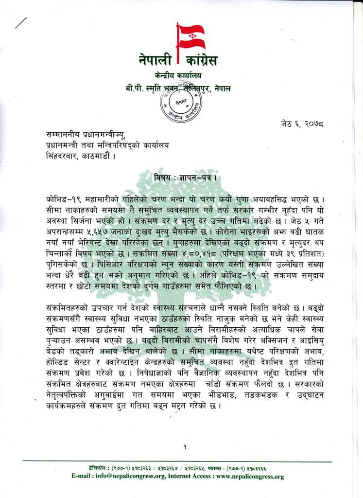 कोरोनाको पहिलो चरणमा स्वास्थ्य सामग्री आपूर्तिमा देखिएको भनिएको अनियमितता, भ्रष्टाचार तथा अहिले खोप आपूर्तिमा देखिएको भनिएको कमिशनतन्त्रको सम्बन्धित निकायबाट स्वतन्त्र रुपमा छानबिन गर्नुपर्ने कांग्रेसको माग छ । त्यस्तै हाल देखिएको अक्सिजन अभाव हटाउन कन्सेन्ट्रेटर, प्लान्ट र सिलिण्डरको तत्काल आपूर्ति सुनिश्चित गरी पारदर्शी वितरणको व्यवस्था मिलाउनुपर्ने कांग्रेसको ज्ञापनपत्रमा उल्लेख छ ।