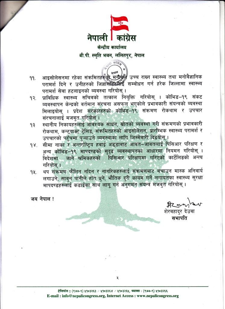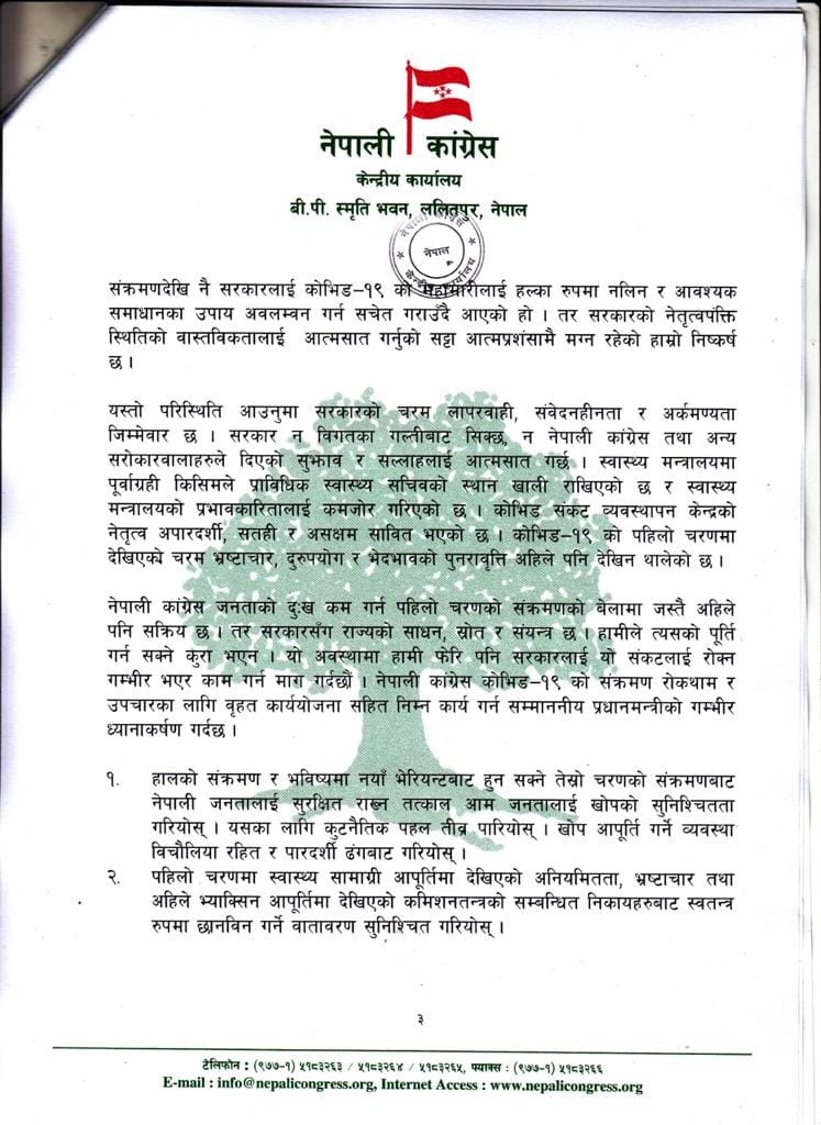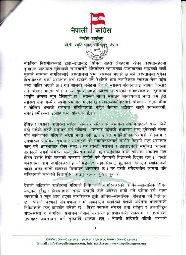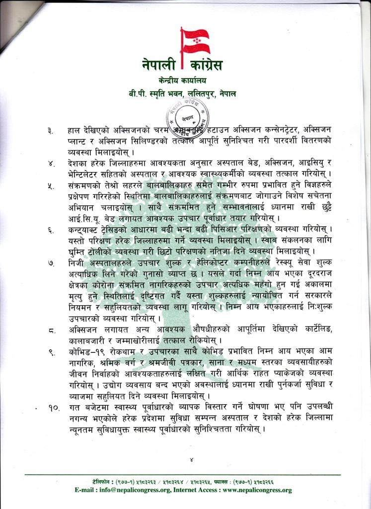 सबै जिल्लामा आवश्यकतानुसार शय्या, अक्सिजन, सघन उपचार कक्ष र भेन्टिलेटरसहितको अस्पताल र आवश्यक स्वास्थ्यकर्मीको व्यवस्था तत्काल गर्नुपर्ने पार्टीको माग छ । संक्रमणको तेस्रो लहरले बालबालिकासमेत गम्भीर रुपमा प्रभावित हुने विज्ञले प्रक्षेपण गरिरहेका स्थितिमा तिनलाई जोगाउने विशेष सचेतना अभियान चलाउन कांग्रेसले प्रधानमन्त्रीसँग आग्रह गरेको छ ।