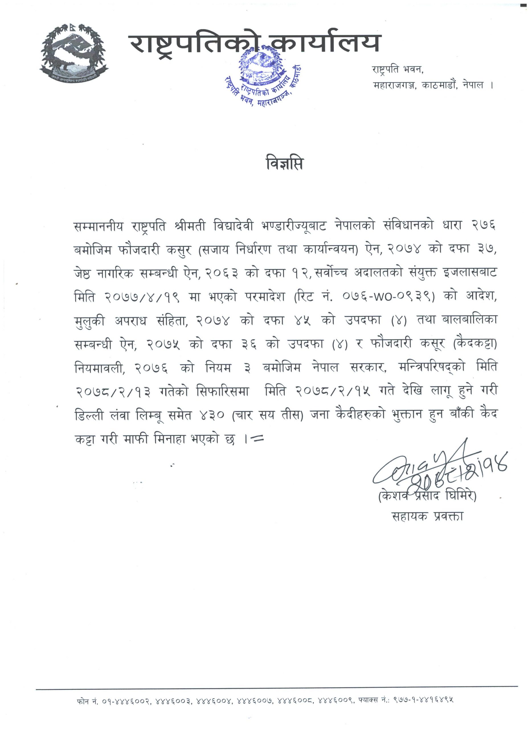 मन्त्रिपरिषदको सिफारिसमा राष्ट्रपतिले ४ सय ३० जना कैदीको बाँकी कैद मिनाहा गर्नुभएको राष्ट्रपति कार्यालयले जनाएको छ ।