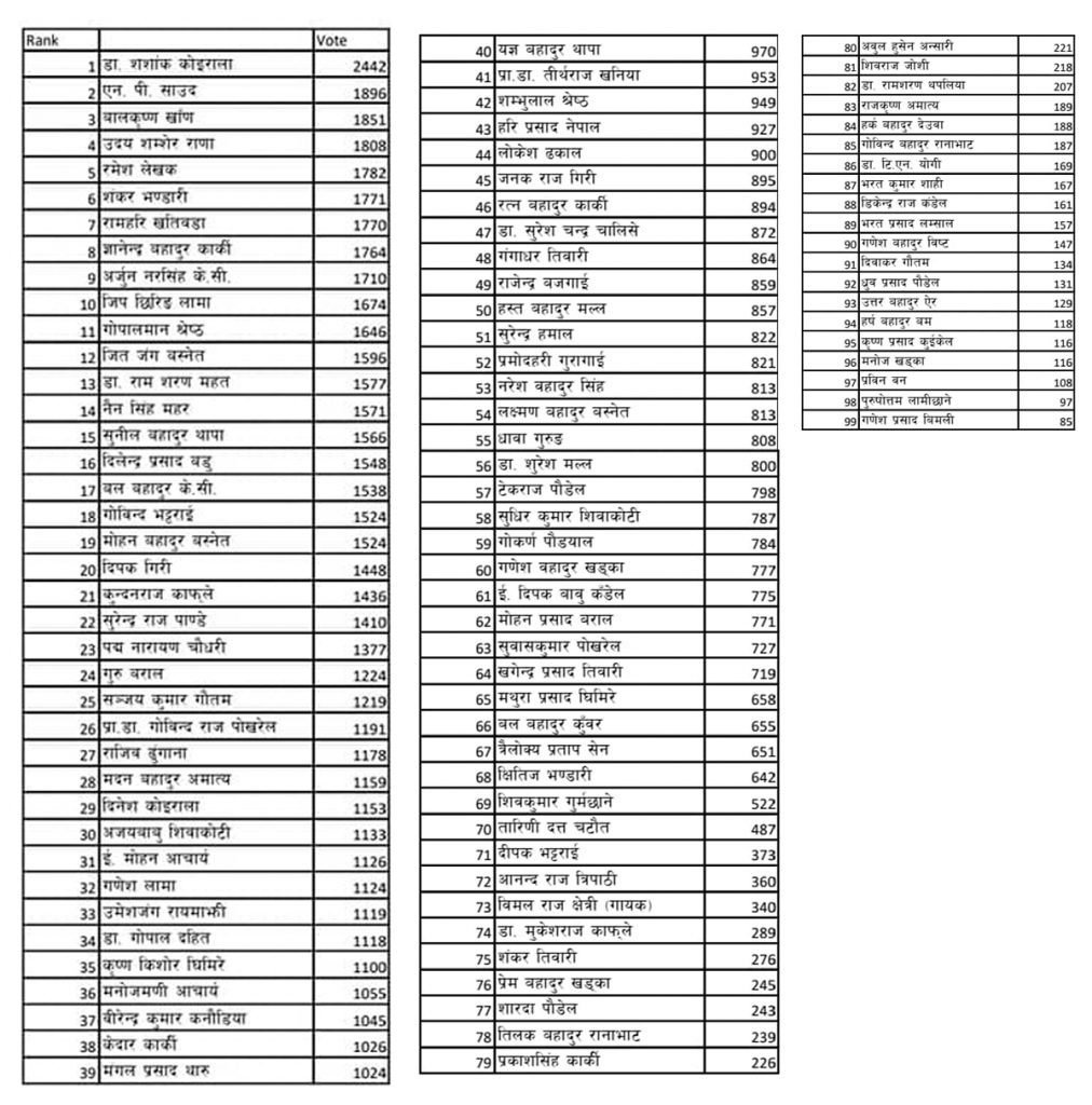 काठमाडौं– नेपाली कांग्रेसको खुलातर्फ केन्द्रीय सदस्य पदको आइतबार साढे ३ बजेसम्म २९९३ मतगणना भएको छ । जसअनुसार शशांक कोइरालाले सर्वाधिक २४४२ मत पाउनुभएको छ । कांग्रेस खुलातर्फको केन्द्रीय सदस्यको मतगणना शनिबारदेखि सुरु भएको हो ।