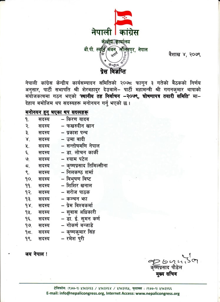 काठमाडौं । प्रधानमन्त्री एवम् नेपाली कांग्रेसका सभापति शेरबहादुर देउवाले पार्टीको स्थानीय तह निर्वाचन–२०७९, घोषणापत्र तयारी समितिु मा थप १९ जना सदस्य मनोनयन गरेका छन् ।